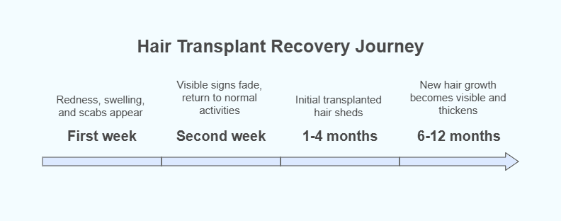 First week: Expect redness, mild swelling, and small scabs around transplanted follicles. These typically resolve within 7-10 days. Pain is minimal and can be managed with over-the-counter medications.