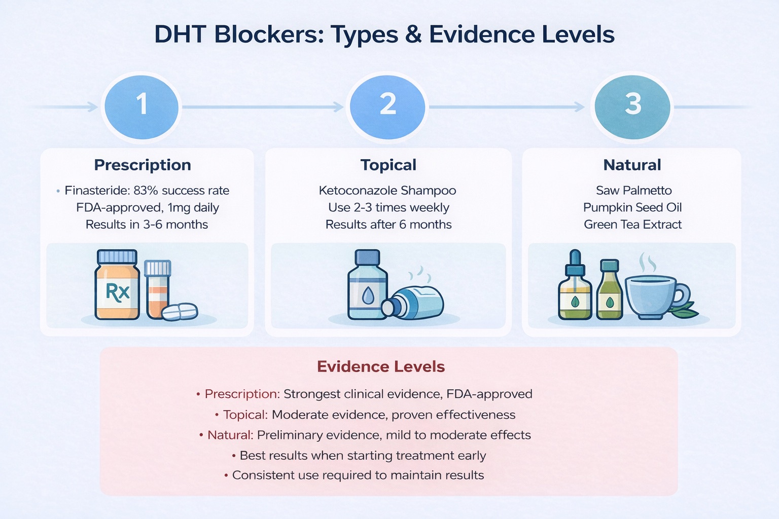 - DHT blockers vary significantly in effectiveness, with prescription medications showing the strongest scientific evidence for preventing hair loss