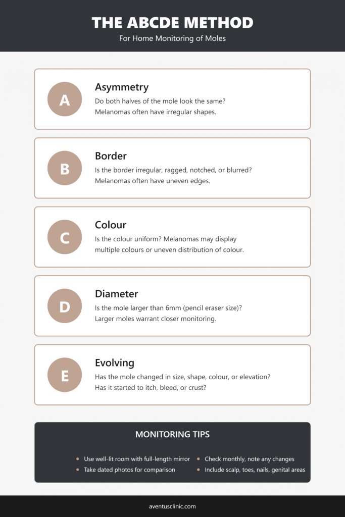 - Use the ABCDE method (Asymmetry, Border, Color, Diameter, Evolution) to monitor moles effectively at home.